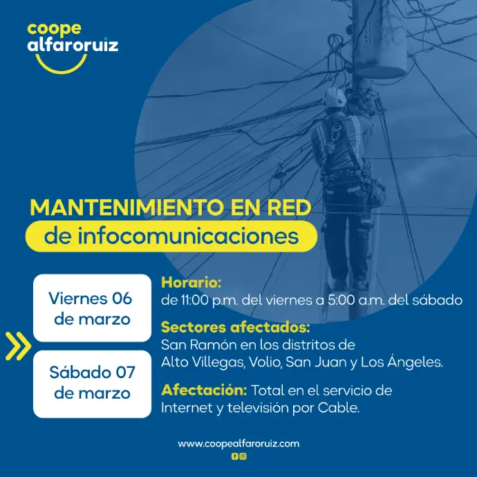 Mantenimiento en el sector de San Ramón, iniciando a las 11:00 p.m. del viernes 06 de marzo y finalizando a las 5:00 a.m. del sábado 07 de marzo.